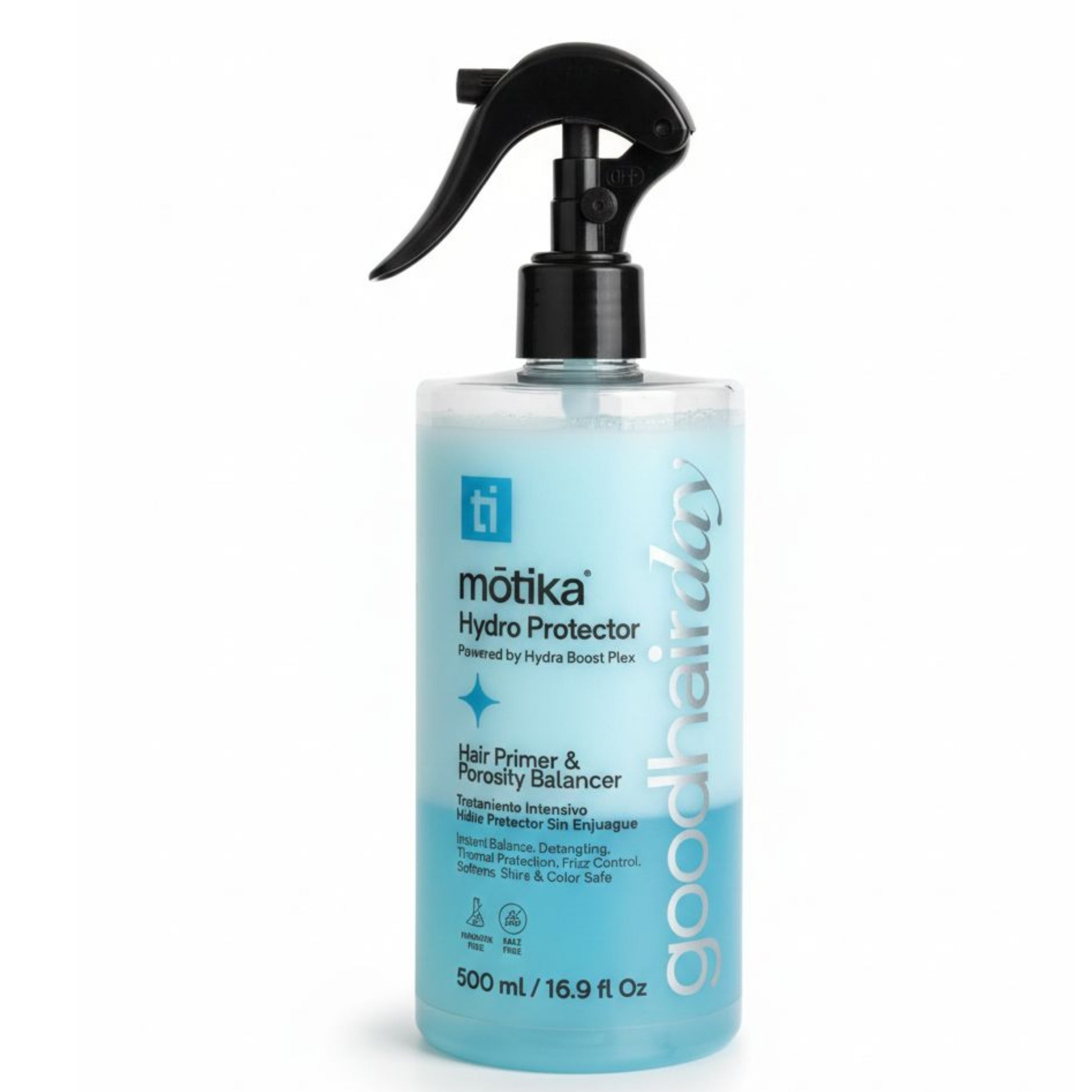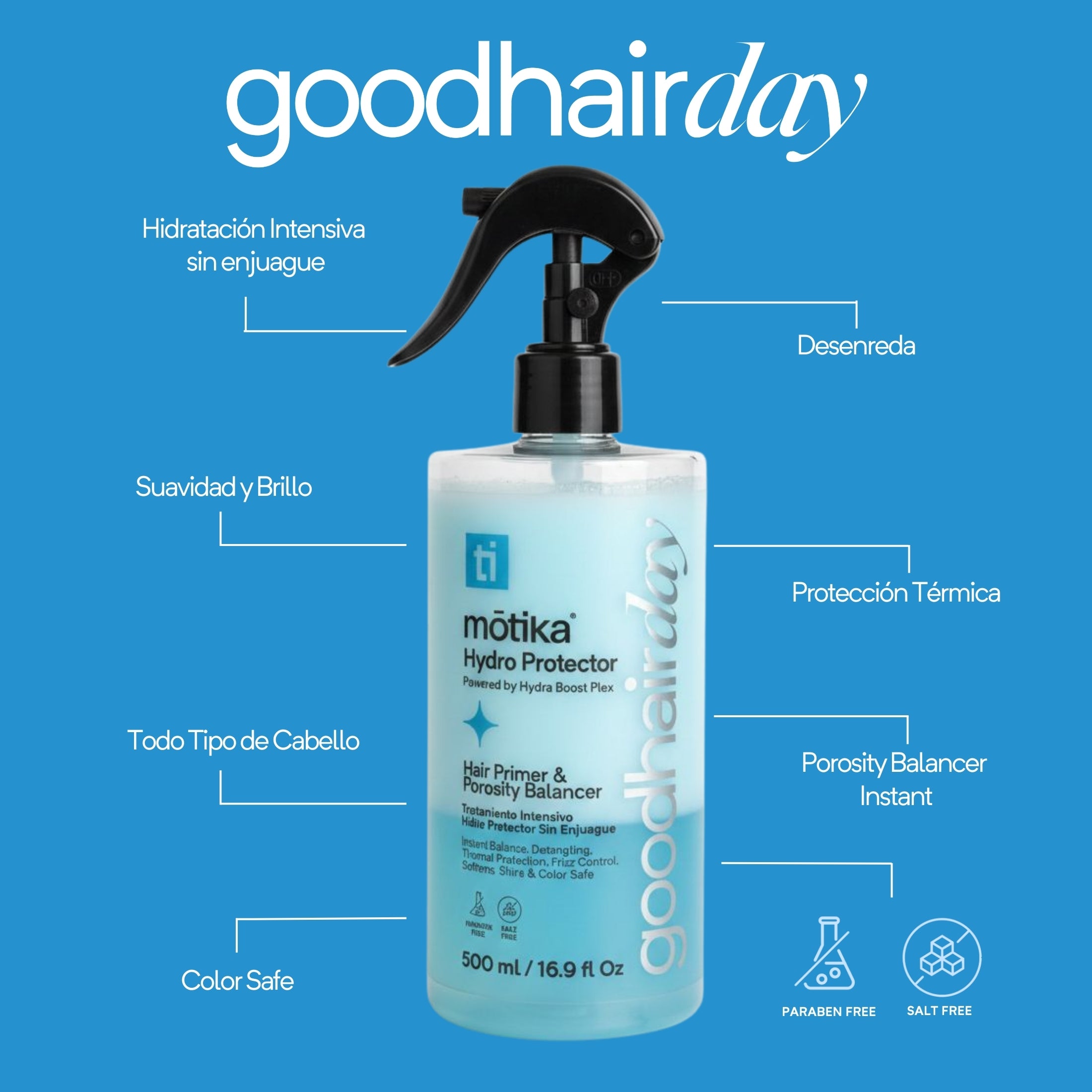 Good Hair Day de mōtika es un tratamiento hidratante intensivo sin enjuague, gracias a su tecnología Hydra Boost Plex, aporta desenredo inmediato, protección térmica, control de frizz y cuidado del color.
